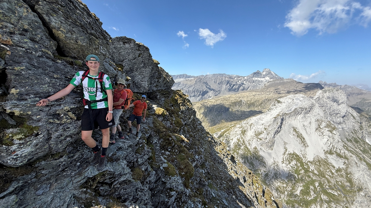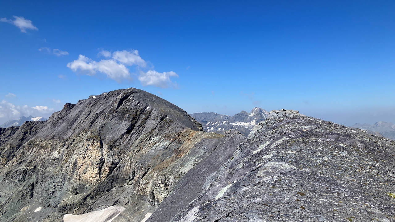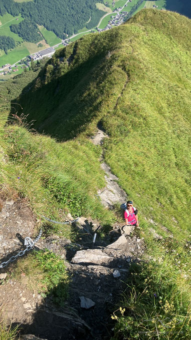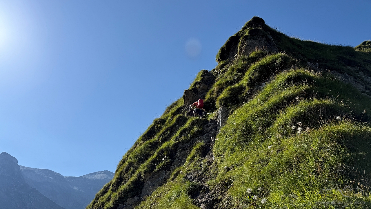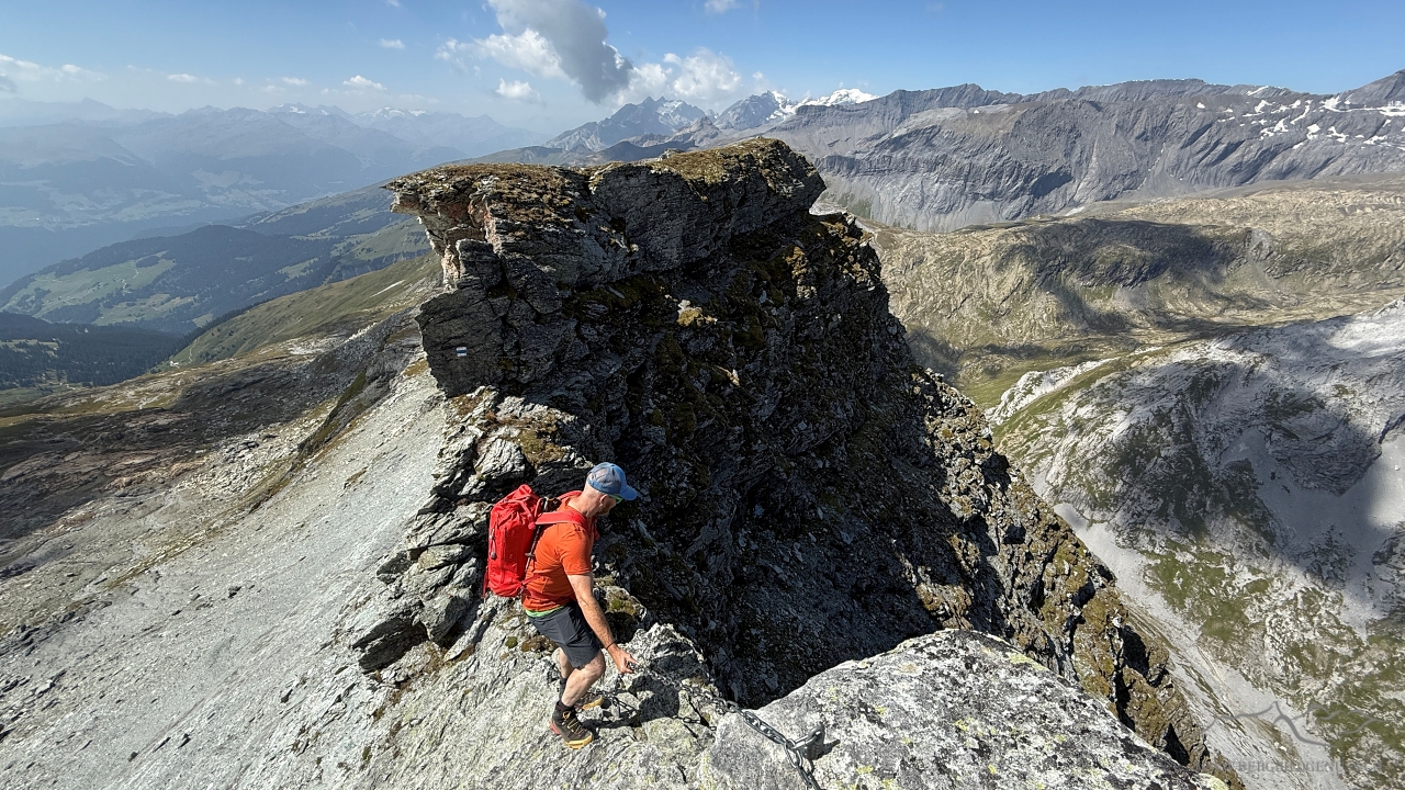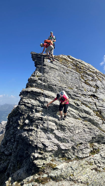 Nach einer kurzen Pause geht es für uns weiter über den Gandstock zum Mittetaghorn. Teilweise stotzig und sogar kettenversichert führt auch dieser Weg sehr effizient in die Höhe, mit Wanderwegen Berge vermessen ist hier ganz offensichtlich kein Thema. Am Gipfel geniessen wir das Wetter, die prächtige Aussicht und was Leckeres aus dem Rucksack. Nicht zu viel, denn die Hütte ist nicht mehr weit weg und wir freuen uns schon jetzt auf ein Plättli oder dergleichen auf der Hüttenterrasse.