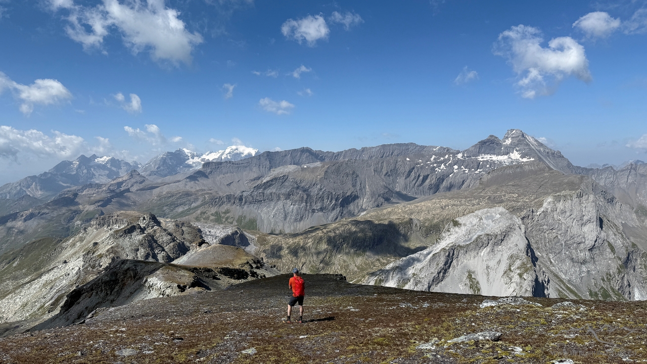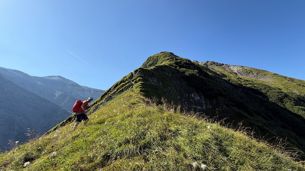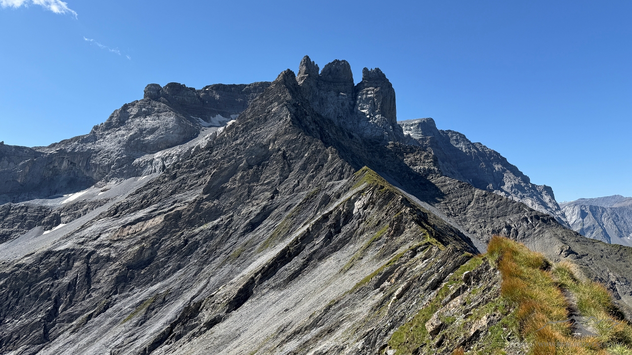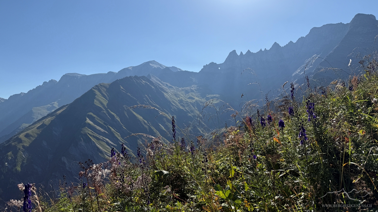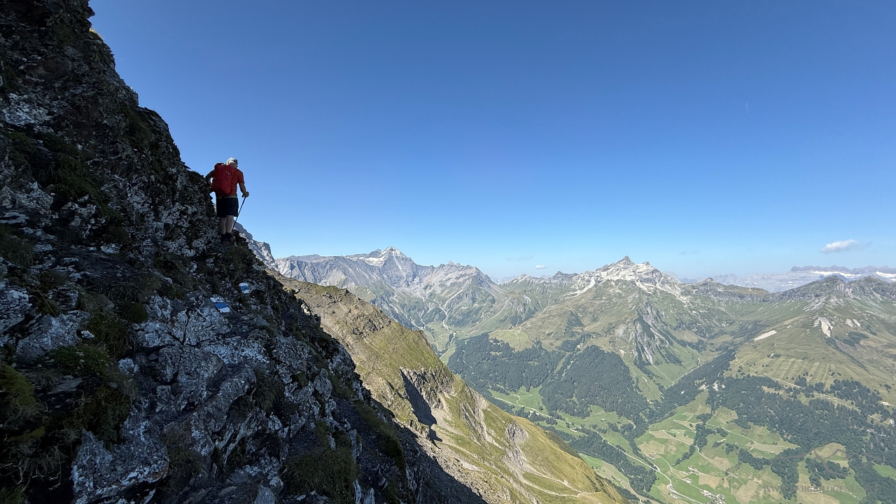 Nach einer kurzen Pause geht es für uns weiter über den Gandstock zum Mittetaghorn. Teilweise stotzig und sogar kettenversichert führt auch dieser Weg sehr effizient in die Höhe, mit Wanderwegen Berge vermessen ist hier ganz offensichtlich kein Thema. Am Gipfel geniessen wir das Wetter, die prächtige Aussicht und was Leckeres aus dem Rucksack. Nicht zu viel, denn die Hütte ist nicht mehr weit weg und wir freuen uns schon jetzt auf ein Plättli oder dergleichen auf der Hüttenterrasse.