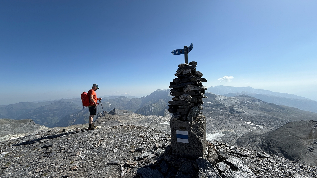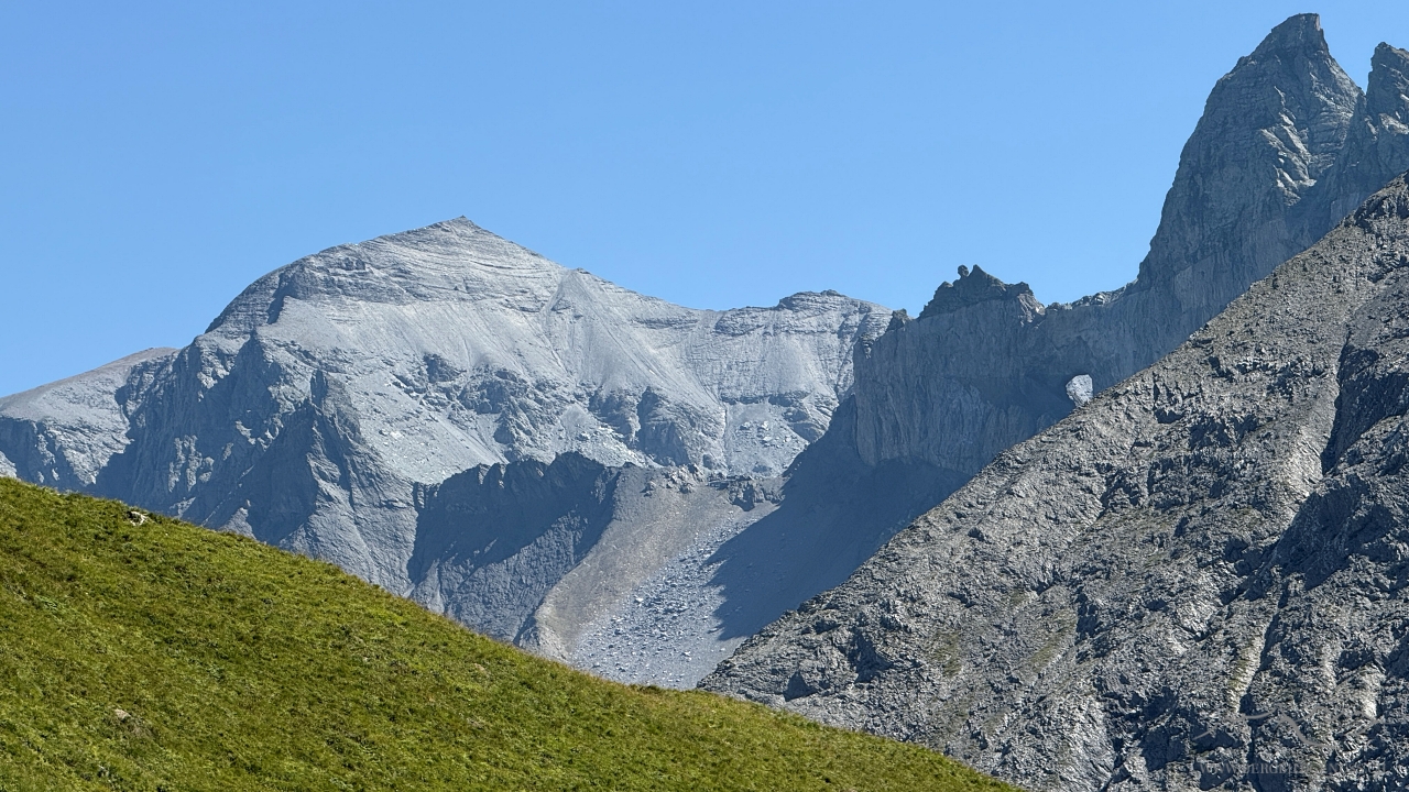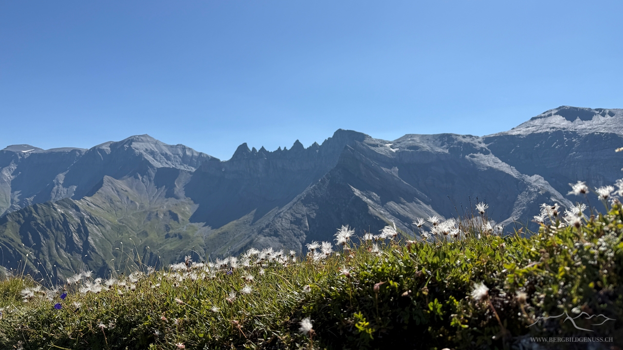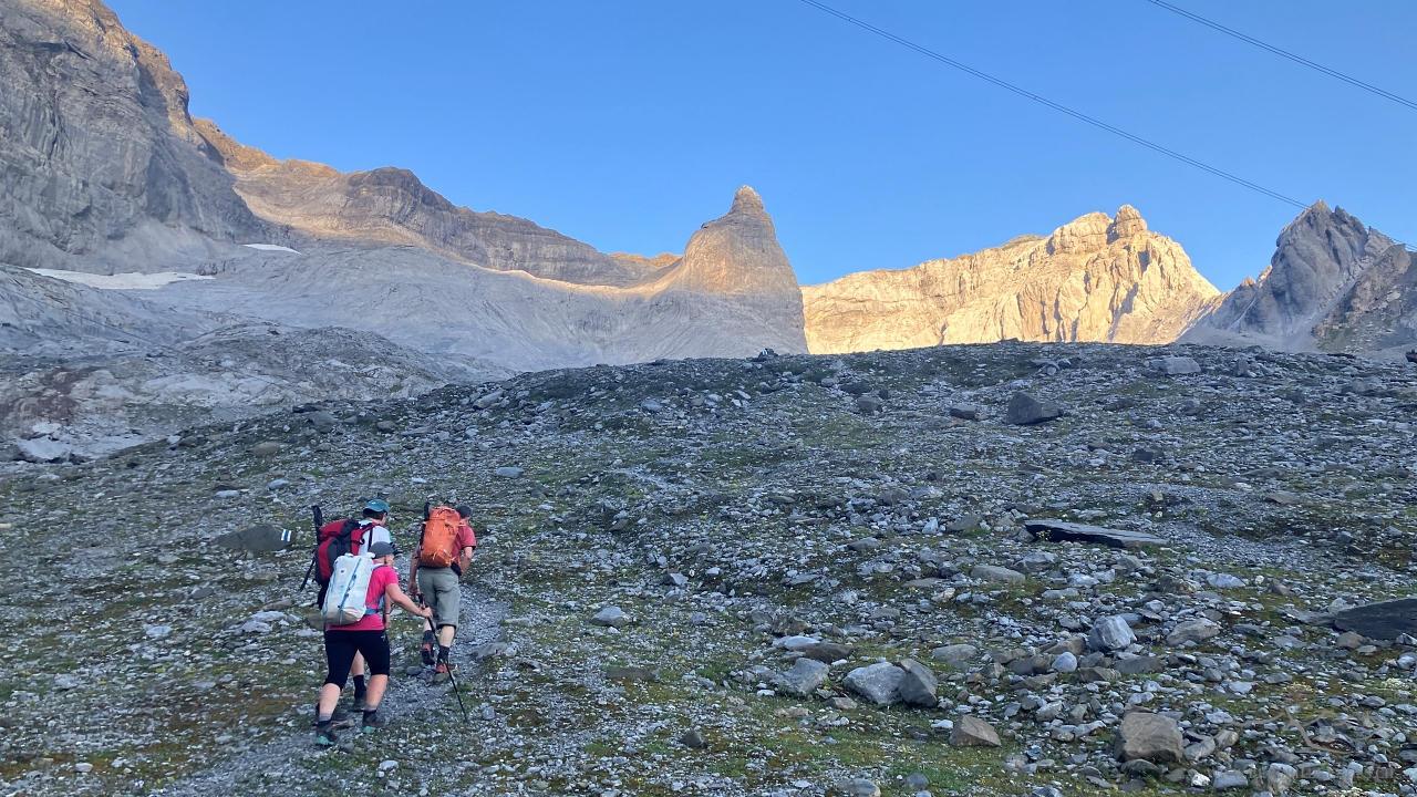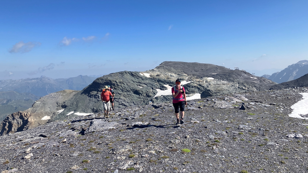 Nach einer kurzen Pause geht es für uns weiter über den Gandstock zum Mittetaghorn. Teilweise stotzig und sogar kettenversichert führt auch dieser Weg sehr effizient in die Höhe, mit Wanderwegen Berge vermessen ist hier ganz offensichtlich kein Thema. Am Gipfel geniessen wir das Wetter, die prächtige Aussicht und was Leckeres aus dem Rucksack. Nicht zu viel, denn die Hütte ist nicht mehr weit weg und wir freuen uns schon jetzt auf ein Plättli oder dergleichen auf der Hüttenterrasse.