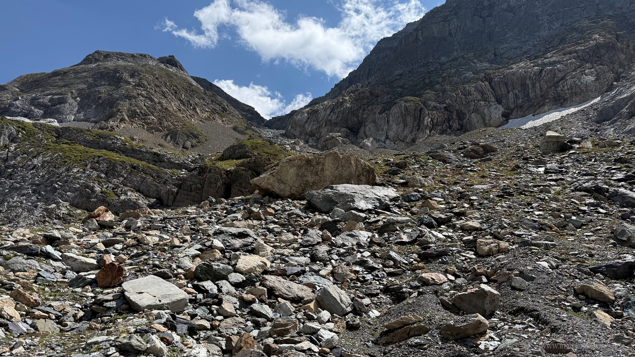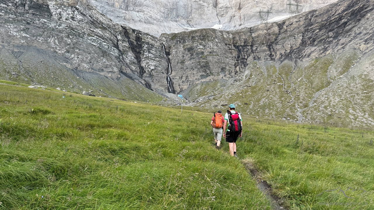 Bei der Sether Unterkunft machen wir ausgiebig Pause, bevor es zu Tale geht. Ab hier könnten wir noch weiter der ViaGlaralpina bis zum Panixerpass folgen, doch wir wählen den direkten Abstieg zum Hexenseeli. Wegspuren und einige alte Markierungen weisen die Richtung durch die markante Rinne, welche in Richtung Nordenwest hinunterzieht. Irgendwann verlieren sich die Wegspuren und man findet sich in einem Geröllfeld wieder. Hier gehen wir der Nase nach, ab und an lassen sich leichte Spuren erkennen, mehr aber auch nicht. Einfach immer in Richtung Hexenseeli halten...so erreichen wir auch den markierten Weg, welcher uns schlussendlich nach Wichlen zum Gelände des Waffenplatzes führt. Ennet der Brücke über den Wichlenbach bedeuten Sonnenschirme, dass hier unsere Erfrischungsgetränke warten.